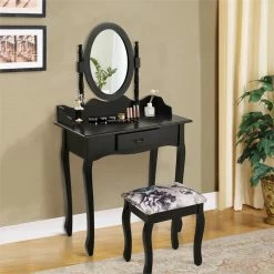 Best Sale ๐ Bowery Hill Furniture Wood Vanity Set With Stool And Mirror In Black โ๏ธ