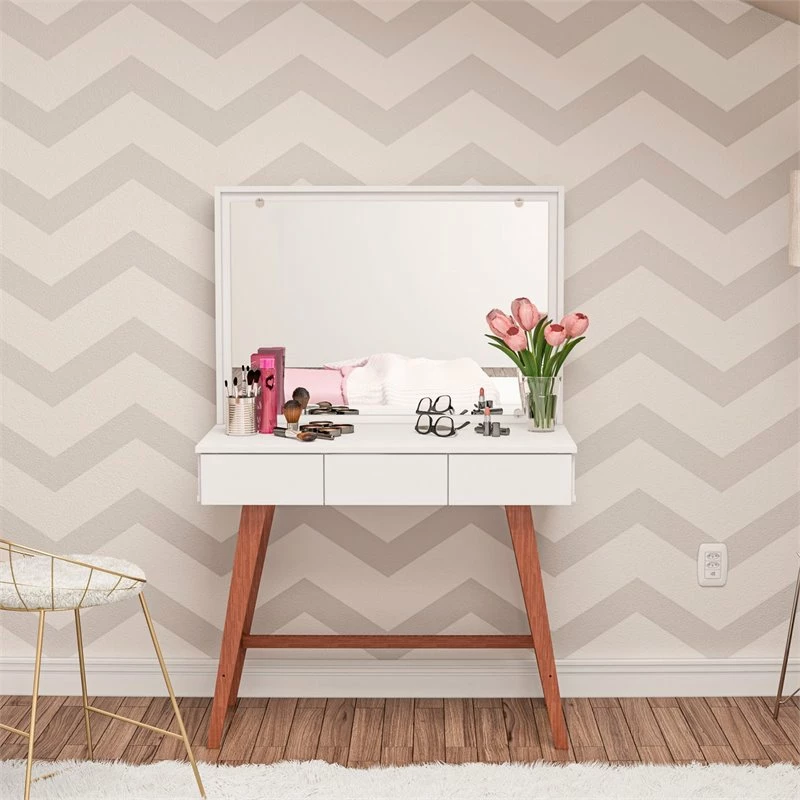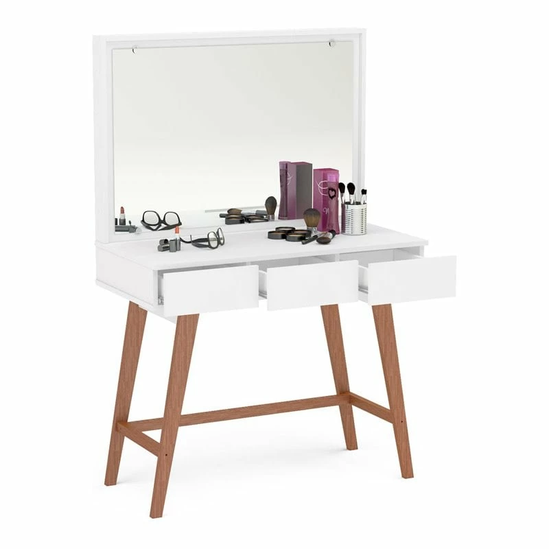 Exude modern sophistication with the Boahaus Urban dressing table. The white top with natural wood legs and three well appointed drawers are fashioned without drawer pulls offers an urban edge to the streamlined look. With a large top desk and mirror this exuberant piece is perfect to for makeup and even works fine to use it as study desk. The size makes it a great addition to small spaces, and the clean silhouette and style is ideal for any room and decor. The Boahaus products are Carb Composite Compliant Phase II which meets the highest environmental standards and it fulfils ISTA 3A standards to ensure optimum safety during transit.