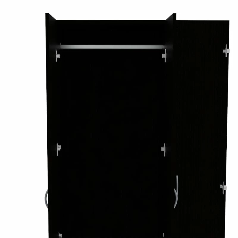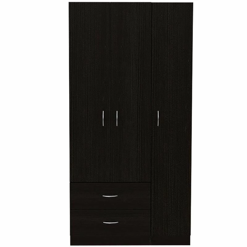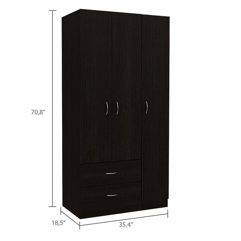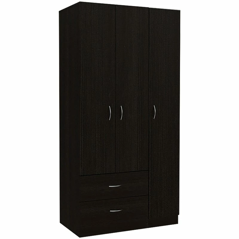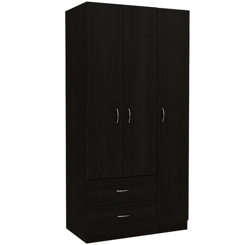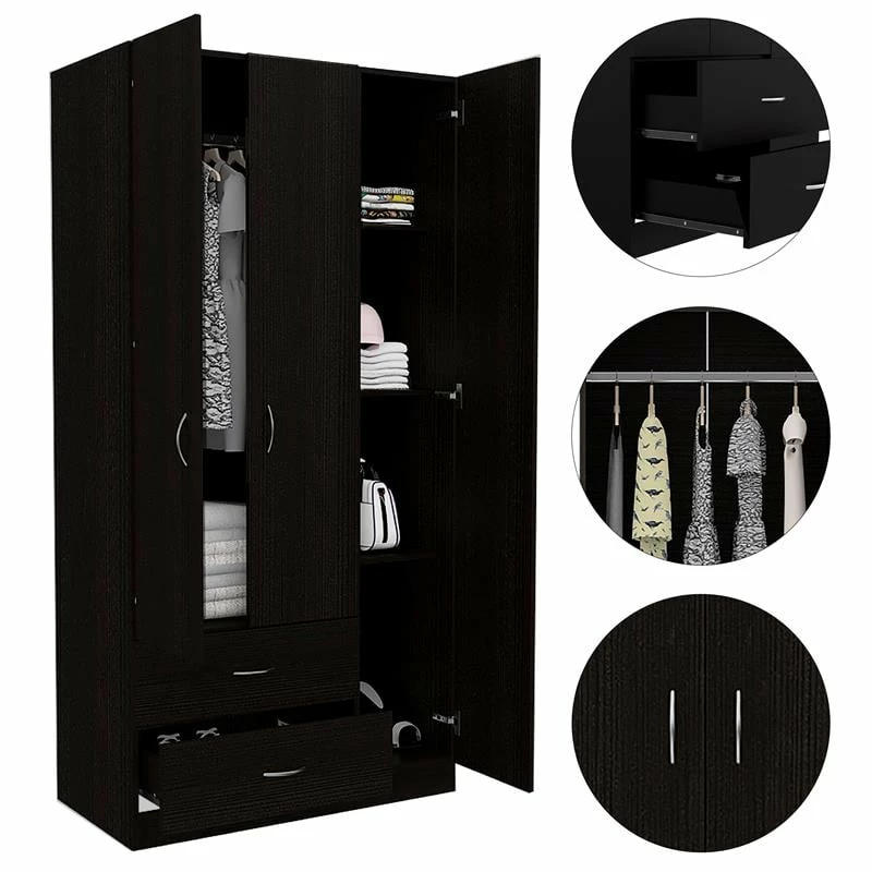 This beautifully spacious, Bowery Hill Black Modern Engineered Wood 3 Door Armoire features 3 doors and 2 drawers. With a covered hanging rail and 4 shelves, this versatile piece will help you store almost anything you will need while maintaining access for whenever you might to grab and go. It´s an ideal fit for your bedroom, garage, living room, or kitchen, adding storage space, but not sacrificing the modern style and look you desire. Perfect for small and big rooms alike.