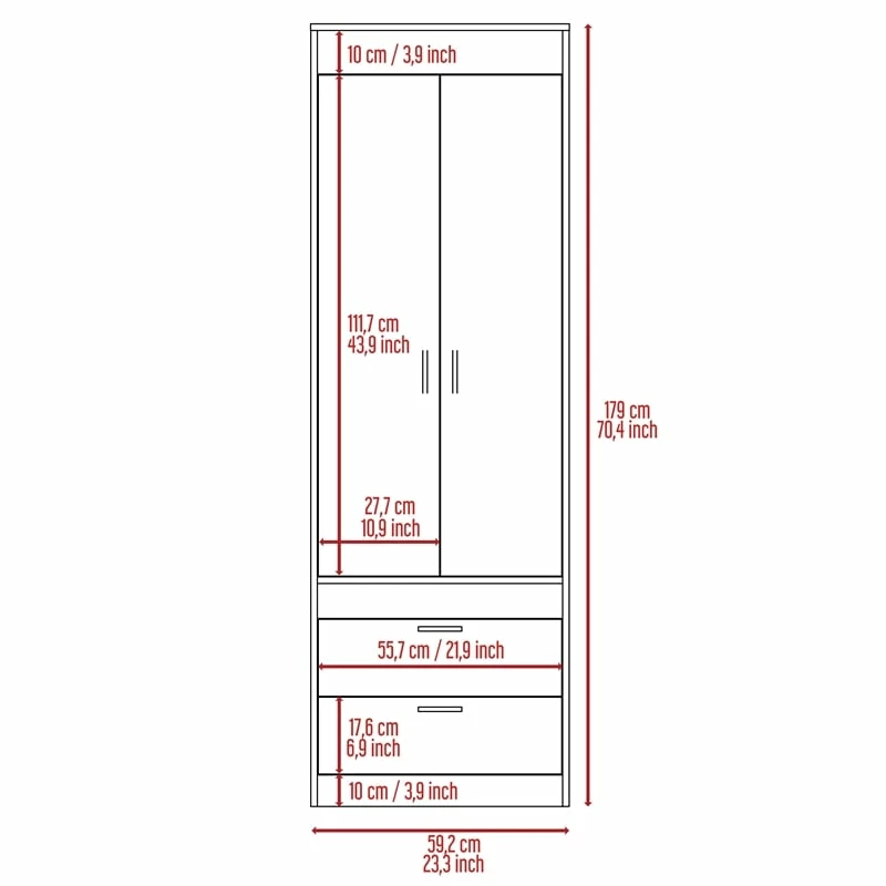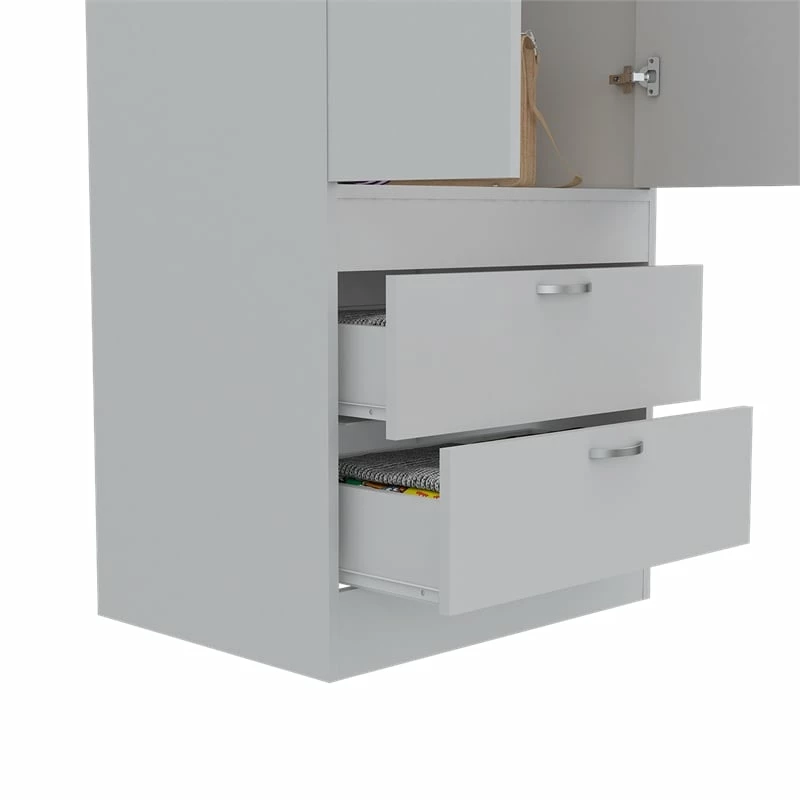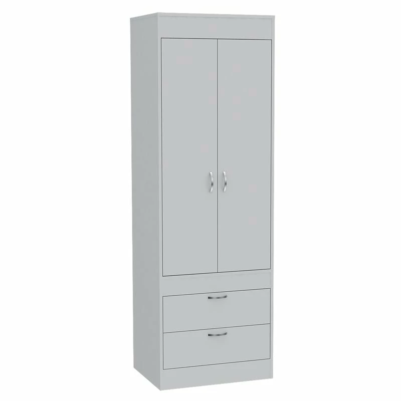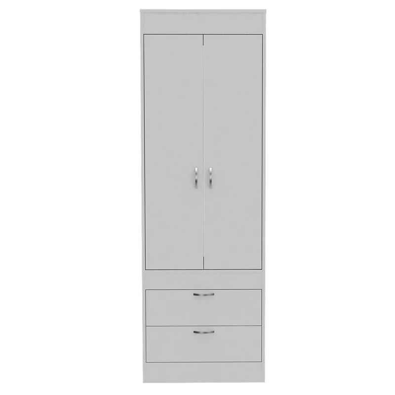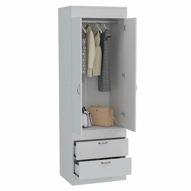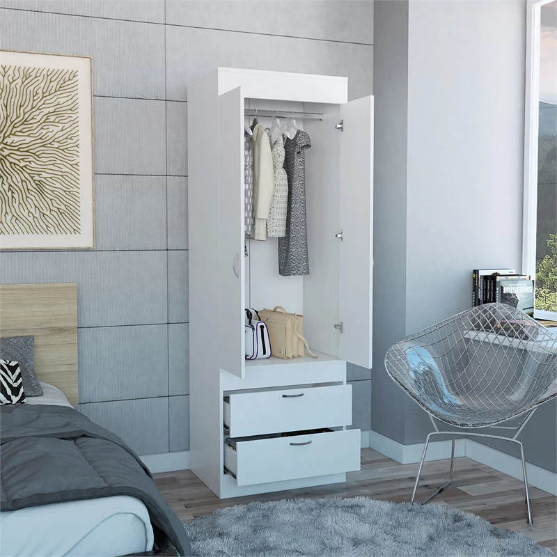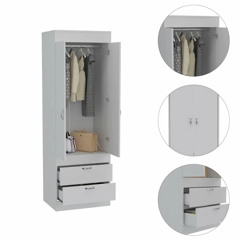 This beautifully spacious, Bowery Hill Armoire features 2 doors and 2 spacious drawers. With a covered hanging rod will help you store anything you will need. It´s an ideal fit for your bedroom, garage, living room or kitchen. Its the perfect solution for extra storage in limited space rooms. This Bowery Hill Wood Contemporary 2 Drawer 2 Door armoire in White will be a undoubtedly a great addition to your home décor. Add a touch of elegance to your home setting. The modern design showcases for a timeless aesthetic that goes with a wide range of decor themes. It has a simplicity and a flare all at once, as if inspired by the simple gown that is confident in taking up its space.