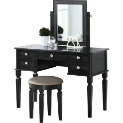 Are you looking for a new makeup station for your bedroom? Treat yourself to a special place to get ready in the morning with this classic vanity set. This vanity set is a perfect pick for warm, transitional-style fans. It is carefully crafted from selected solid and manufactured woods and offers square tapered legs, crystal-like hardware knobs, and an adjustable tilt mirror. If that weren’t enough, it is complemented by a matching round stool with an upholstered seat cushion. A storage-friendly function is included; five drawers offer a spot to tuck away your makeup, toiletries, and other beauty essentials. Available in 4 different colors: galaxy black, white, champagne, and rose gold colors.