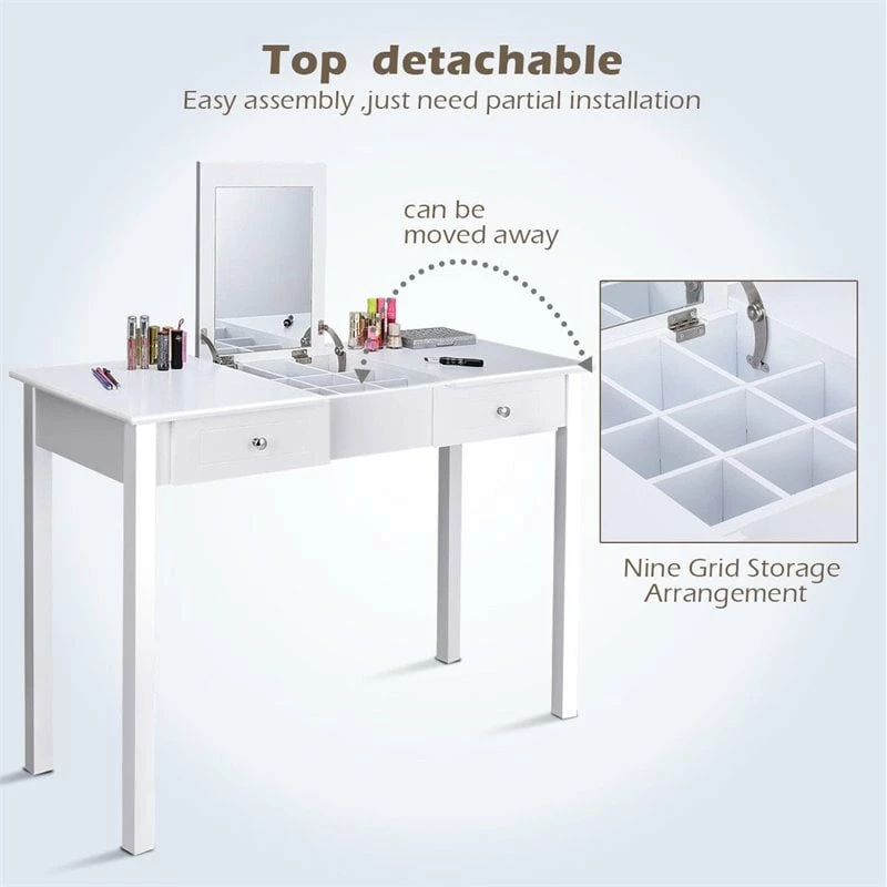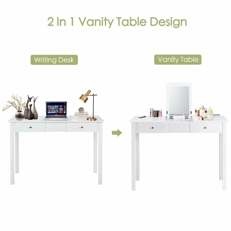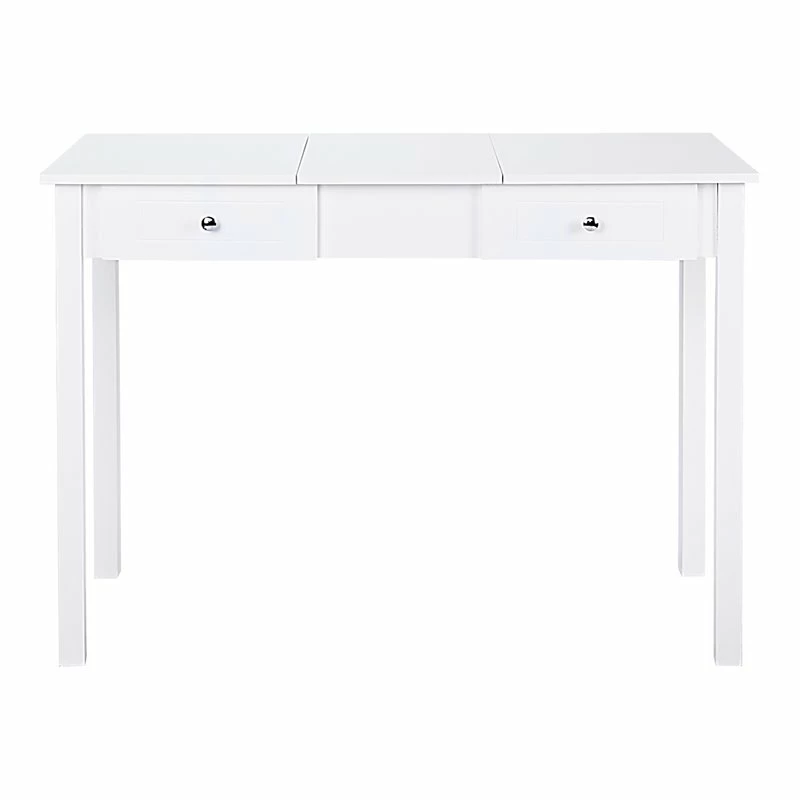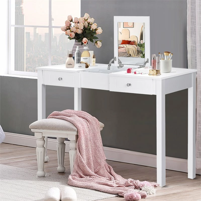 Are you looking for a unique and classic dressing table? Would you like to try vanity table set? It is in classic white color, which makes it look compact. It can be a fine display of your room. The amazing of this dressing table set is that it has a flip-top mirror, You can well make yourself up in front of them. Lift the table top when you using it, you could use it as a makeup table, it is quite suitable for you. And when you put the lid down, it becomes an ordinary table, use it for writing or the laptop desk, it’s very user-friendly design. Made of wood and MDF, our product is stable and can serve you for a long time.