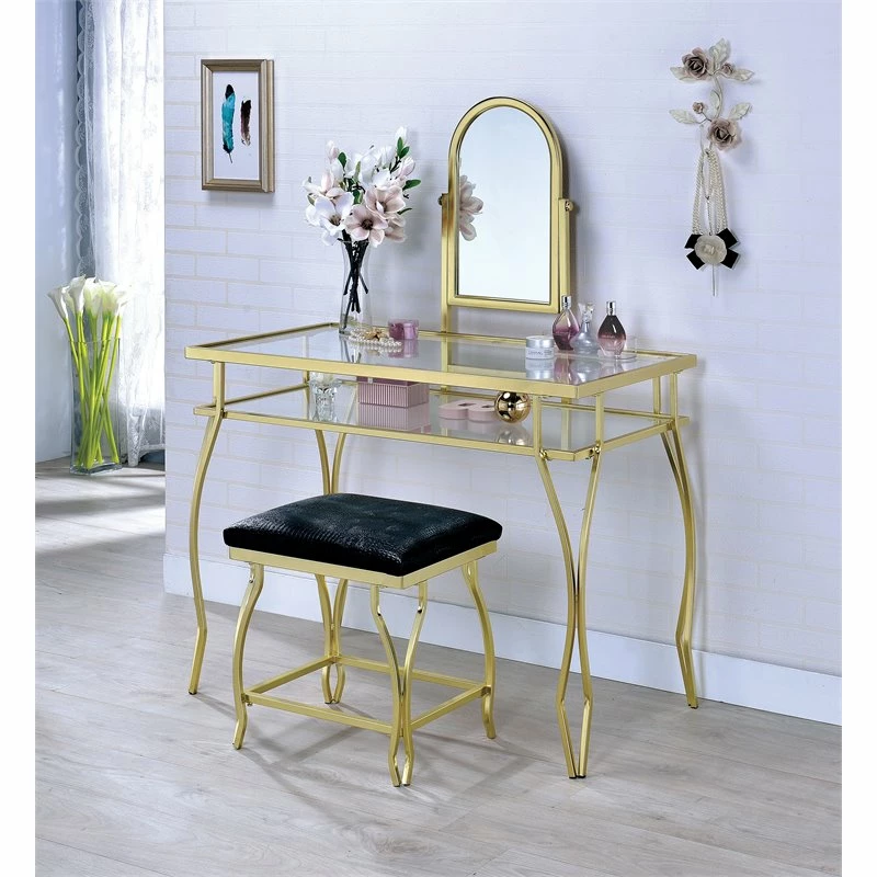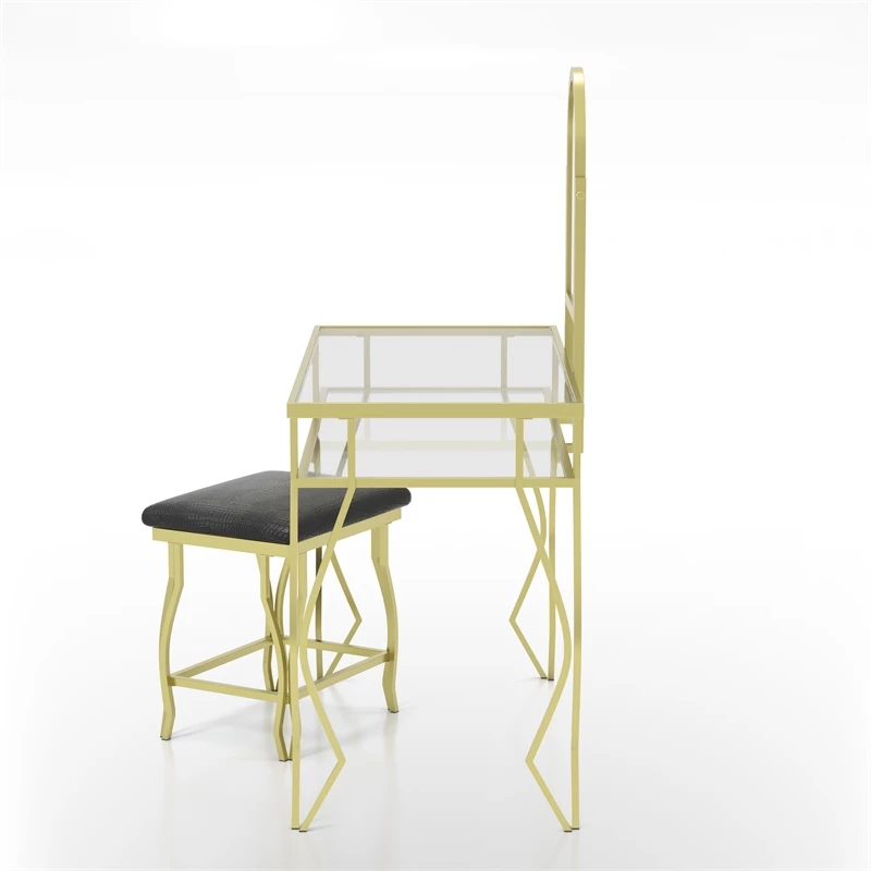 The Klarissa Vanity Set sets a glamorous stage for your make-up routine. The rounded top mirror features an adjustable design that helps capture every angled while the clear tempered glass tabletop and open shelf store make-up, brushes and more. Rest in style on the crocodile textured faux leather stool and fall for the distinguished curved structured metal legs that beautifully pair with the table. Glamorously update your room with the Klarissa Gold Vanity Set.