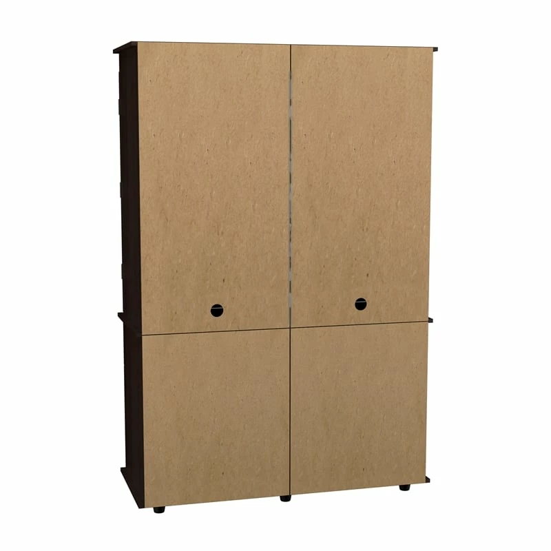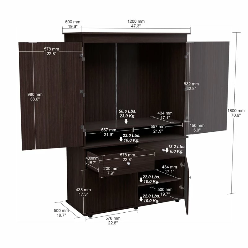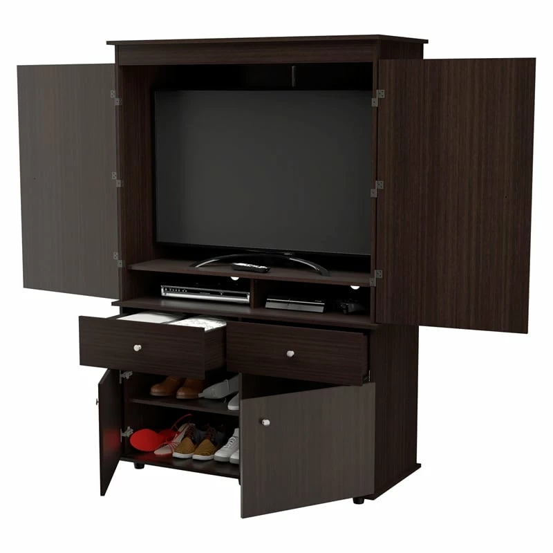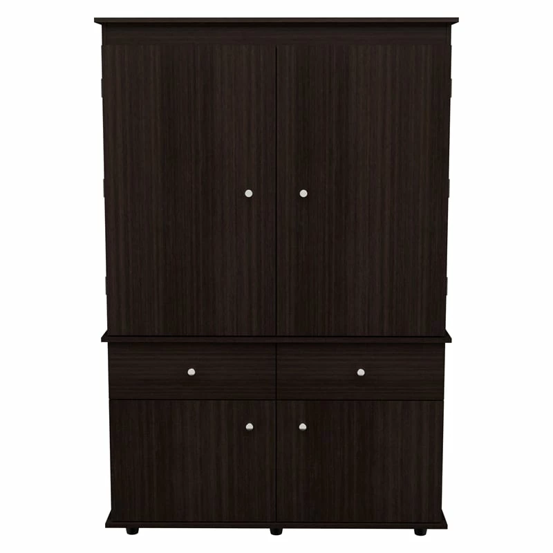 Armoire/AV Video Combo by Inval America finished in a rich Espresso laminates in durable melamine which is stain, heat and scratch resistant. Constructed from manufactured wood. The unit features two (2) large doors with brushed steel knobs which conceal a wide hanging bar for use with all your hanging garment needs. With this multi-purpose unit, you can do away with the hanging bar and use as a TV stand which can also be concealed by closing the two large doors when not in use. All this sits above four (4) bottom doors with brushed metal knobs to provide additional space for all your storage needs.